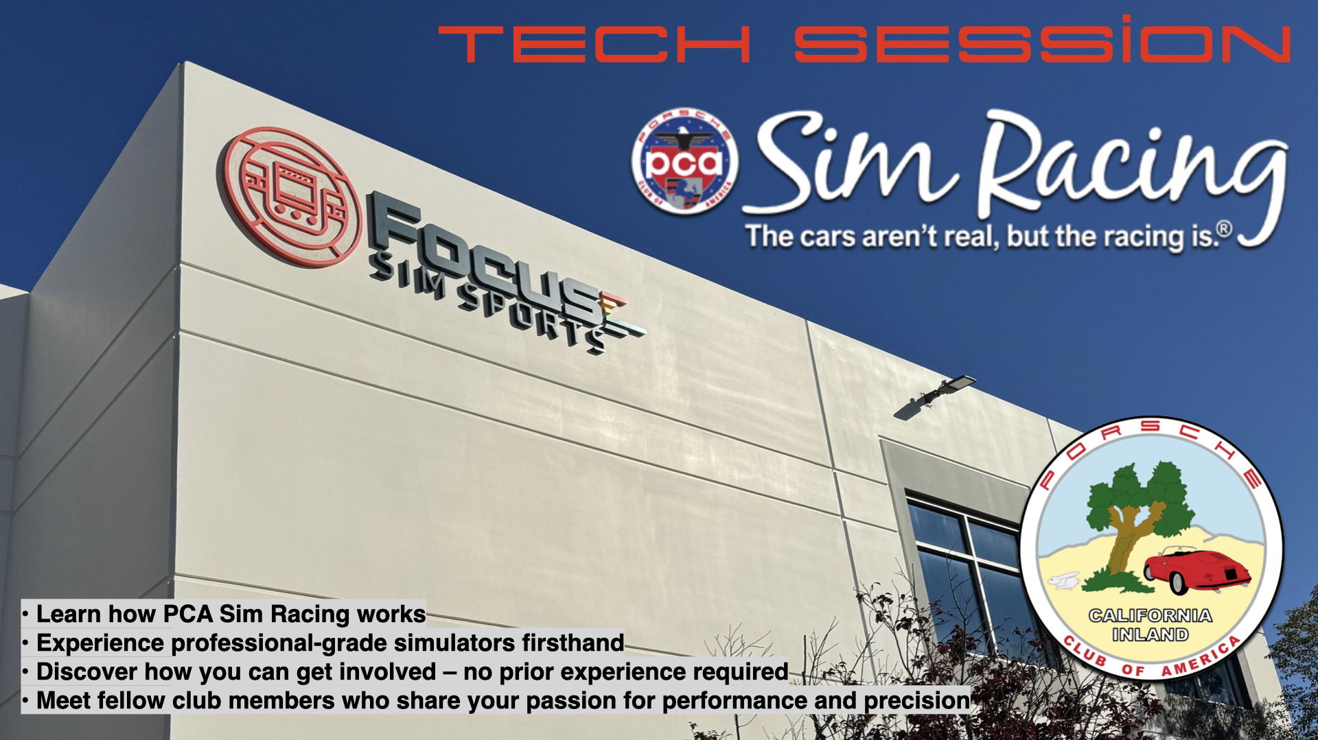 You're invited to a special Information Night at Focus Sim Sports in Santa Clarita on Tuesday, July 22 at 6:30 PM, where we’ll dive into the exciting world of PCA Sim Racing!